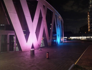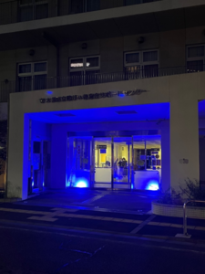 当日はブルーと桜色にグラデーションでライトアップしました。