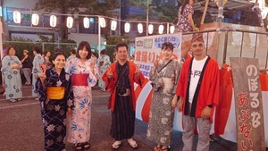 7月19日、大森グリーンベルトにて、「第23回入新井盆踊り大会」が行われ、リュウ インディーさん、チェン イェンシンさん、アウマダ マルティネス ルイサ マリアさん、グェン タン ドンさん、パンタ カシナトさんの5名の国際都市おおた大使が参加しました。浴衣を着て日本の夏の風物詩を味わいました。