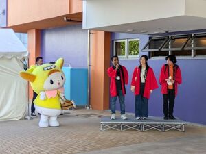 福祉施設であいさつするアザドさん、エリさん、ララさん