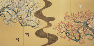 また、町立湯河原美術館との所蔵作品の交換展として、平松礼二作品展を本展と共に同時開催します。日本画家・平松礼二(1941-)は、19歳の時、1962年の青龍展に入選し、青龍社が解散する1966年まで龍子のもとで教えを受けました。近年では、フランスのジベルニー印象派美術館での展示やクルーズ船「飛鳥3」の船内を飾る作品提供など、国内外で華々しく活躍しています。《早春図》(2008、町立湯河原美術館蔵)ほか、装飾的できらびやかな作品を併せてお楽しみください。