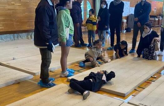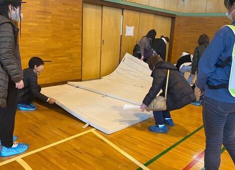 避難所におけるマットの敷き方を学びました。