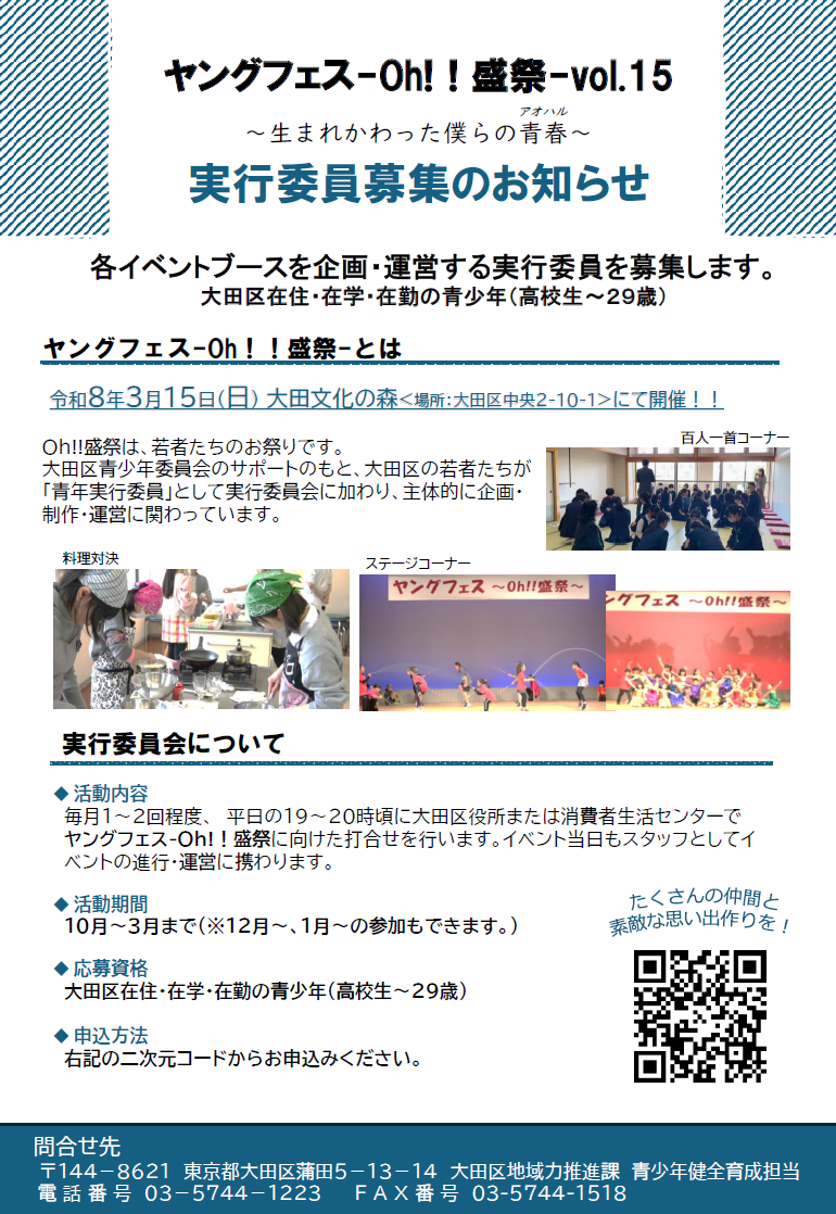 Oh!!盛祭は、若者たちのお祭りです。大田区青少年委員会のサポートのもと、大田区の若者たちが「青年実行委員」として実行委員会に加わり、主体的に企画・制作・運営に関わっています。