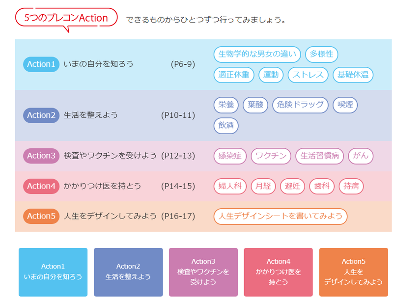 プレコンセプションケアのポイントを学びながら、5つのプレコンActionを起こす準備ができます。できるものからひとつずつ始めてみましょう。