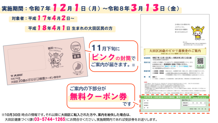 令和7年度に20歳を迎える方を対象に、期間内にピロリ菌検査を無料で受診できる制度です。