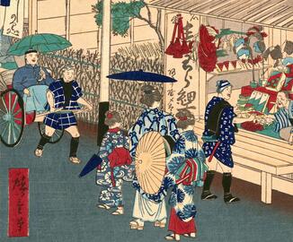 歌川広重(三代)「東京横浜名所一覧図会 大森麦わら細工」明治3年(部分)/当館所蔵