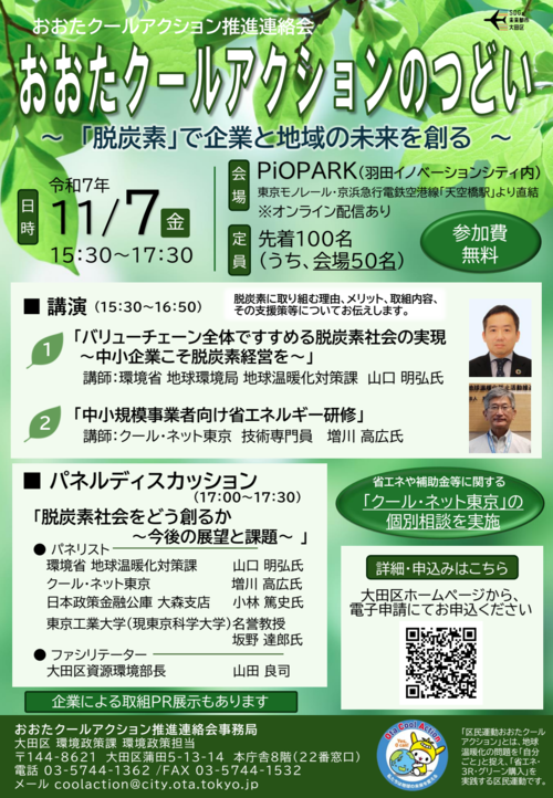 事業者の「脱炭素化」に向けた意識醸成、行動変容の促進を目的とした「おおたクールアクションのつどい」を開催します。