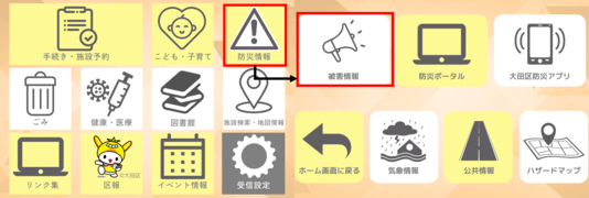 防災情報:被害状況の提供機能や気象情報、公共情報などをご案内、「大田区防災ポータル」、「大田区防災アプリ」のご紹介