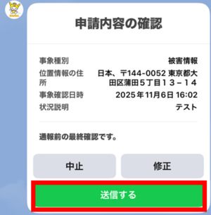 (注釈)本機能は、通常時は受付を行っておりません。一部気象警報等が発令された際に、LINEでの周知とともに受付を開始いたします。また、本機能は119番通報、110番通報とは異なります。必要な場合は別途消防、警察へ通報をお願いいたします。