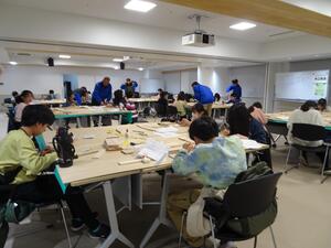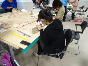 委員さんと一緒に、きりや金づちを使って組み立てていきます。