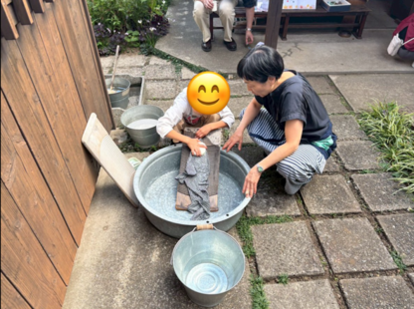 当日は、七輪を使った昼食づくりのほか、すり鉢体験、切り絵遊びなどを行い、子どもも大人も交流をしながら大いに楽しむ機会となりました。特に、呼び水を入れてポンプを押し、手で水をくみ上げる「井戸ポンプ使った洗濯体験」は子どもたちに大人気でした。