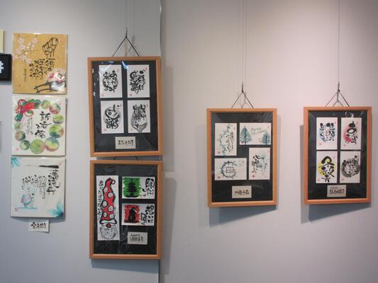 今月は筆文字(己書)をつかってアートに仕上げた絵画の色紙、絵葉書等を展示しています。