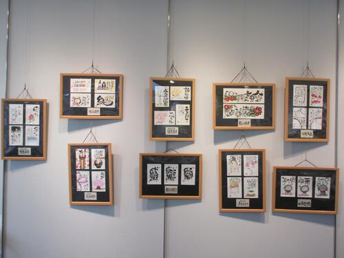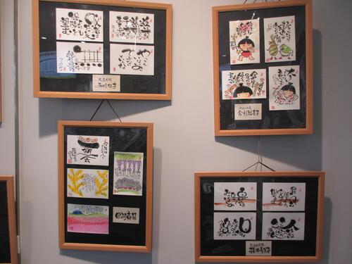 今月は、筆ペンでの筆文字書(己書)や筆文字の入った絵葉書等を展示しています。