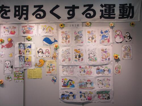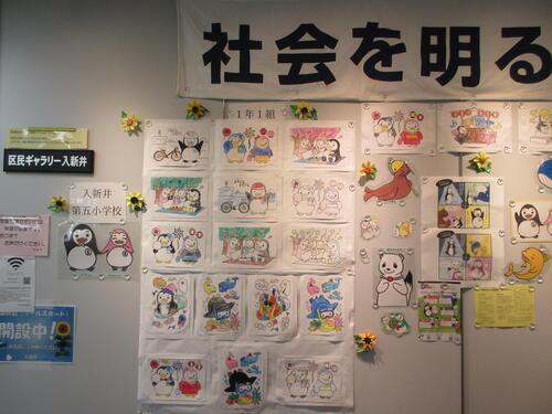 入新井第五小学校の1年生たちによる「社会を明るくする運動」の更生ペンギンのぬり絵作品を展示しています。