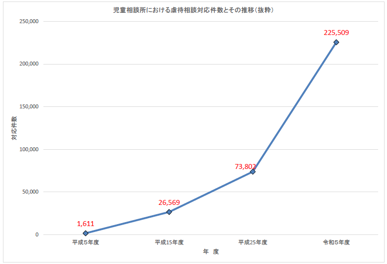 令和5年度中に、全国233か所の児童相談所が児童虐待相談として対応した件数は225,509件となっており、増加傾向にあります。