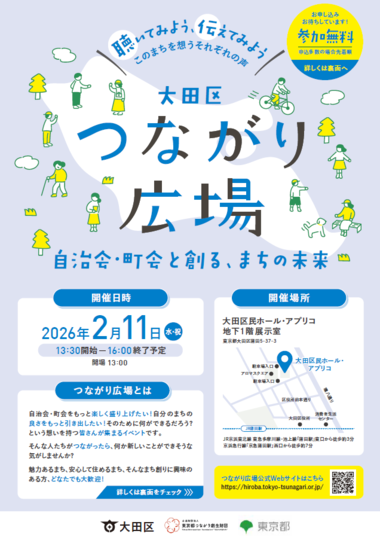 「大田区つながり広場」とは、町会をもっと盛り上げたい!自分のまちの良さをもっと引き出したい!そのために何ができるだろう?という想いを持つ皆さんが集まるイベントです。当日は大田区で活動する自治会・町会さんが東京都・(公財)東京都つながり創生財団・大田区と連携して実施した事業についてご紹介する他、地域で活動する団体・地域貢献に関心の高い企業などとの交流会を実施します。魅力あるまち、安心して住めるまち、そんなまち創りに興味のある方、どなたでも大歓迎!イベントを通じて自分の住む地域の将来を考えてみませんか?
