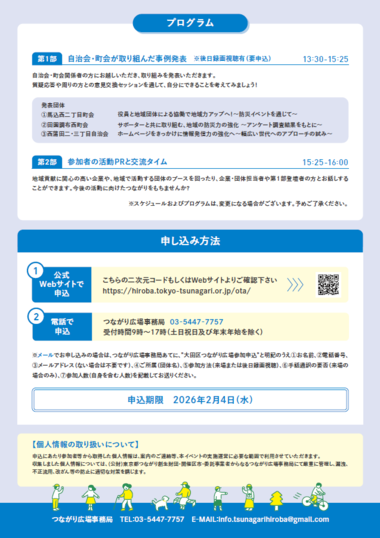 自治会・町会関係者の方にお越しいただき、東京都・(公財)東京都つながり創生財団・大田区と連携して実施した取り組みを発表いただきます。地域で活動する自治会・町会さんの活動を知り、自分にできることを考えてみましょう!