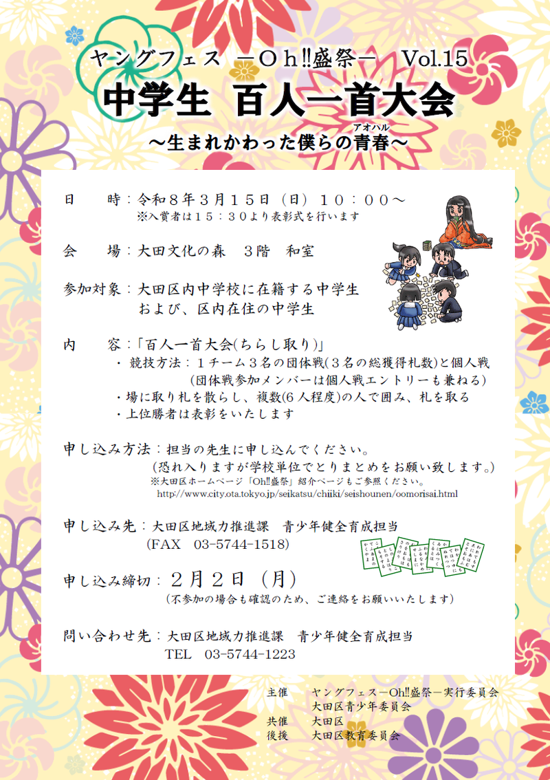 中学生百人一首大会 令和8年2月2日(月曜日)締切(区外在学者は、2月9日(月曜日)締切)