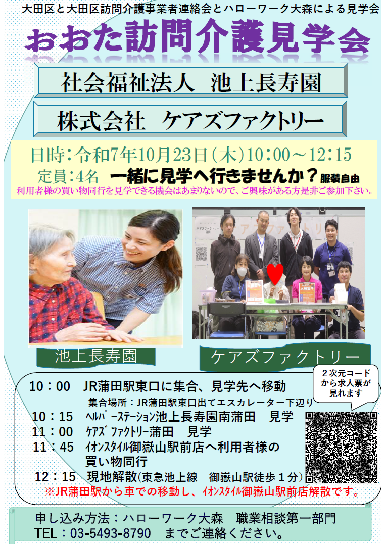 団塊の世代が75歳となり、介護人材の確保はますます重要な課題となっています。区民に質の高い介護サービスを安定して提供するため、特に人材確保が困難で在宅生活に必要不可欠なサービスの訪問介護に特化して、大田区は、ハローワーク大森、大田区介護保険サービス団体連絡会と連携した新たな人材確保対策事業を展開し、区内訪問介護事業所での見学会を実施します。
