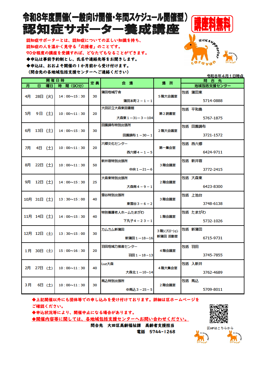 大田区では、主に地域包括支援センターのキャラバン・メイトの資格を持つ職員が講師のため、原則として、休日・夜間の開催はできません。