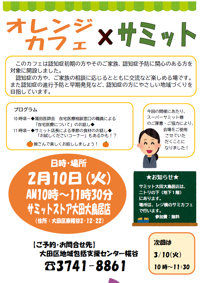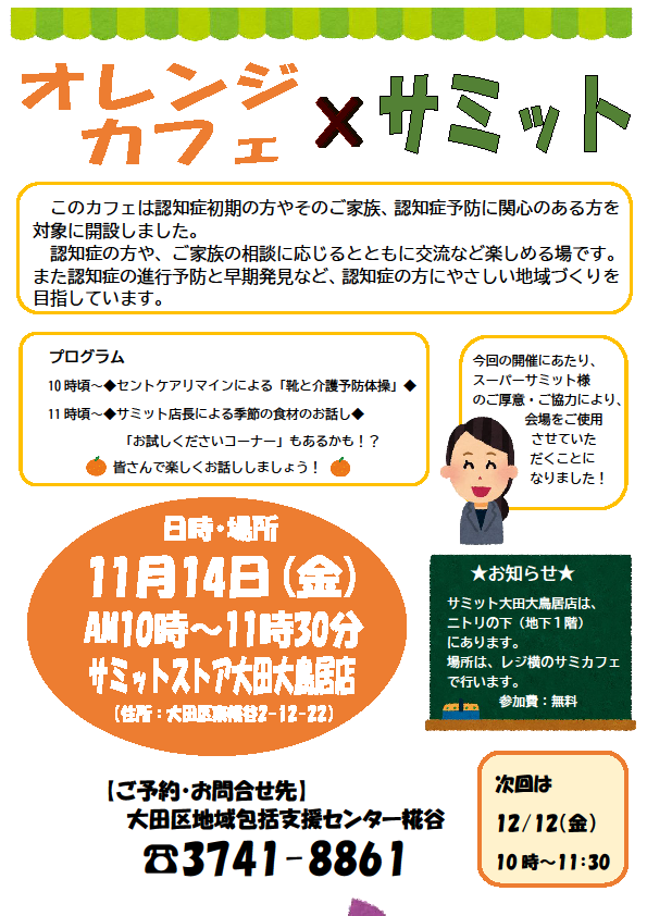 令和5年11月から地域包括支援センター糀谷とスーパーのサミット大田大鳥居店が連携してオレンジカフェを開催しています。