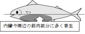 アニサキスが寄生している生鮮魚介類を生で食べることで、アニサキスが胃壁や腸壁に刺入して食中毒を引き起こします。