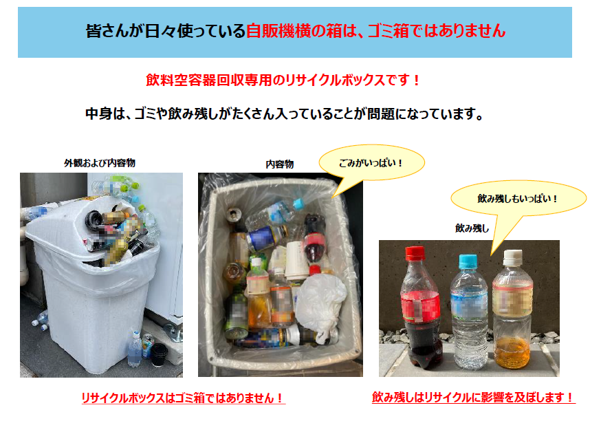 自動販売機横のリサイクルボックスにごみを入れないようにしましょう