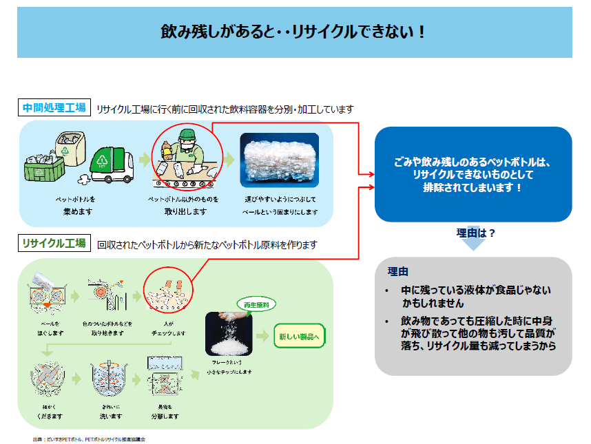 内容物が入った状態でペットボトルを捨てると、そのペットボトルはリサイクルできなくなってしまいます。