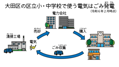 また、大田区の区立小・中学校では、清掃工場でごみを燃やすときに発生する熱で作られた「環境にやさしい電気」を使っています。分かりやすく解説した動画もあります。