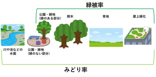 (注釈)みどり率:緑被率に「水面が占める割合」と「公園内の緑でおおわれていない面積の割合」を加えたもの。