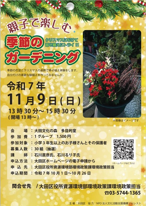 季節の花苗とクリスマスの装飾で寄せ植え体験をします。